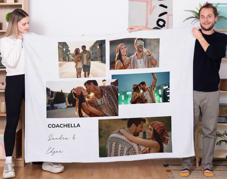 A veces tenemos recuerdos que queremos guardar para siempre, de una manera especial. Para conservar esas fotos significativas, esta manta collage personalizada es perfecta: podrás plasmar tus recuerdos y tenerlos siempre cerquita de ti. Cada vez que sientas frío, podrás abrazar de una manera diferente a tus seres queridos o a tu persona favorita. Es un regalo de cumpleaños ideal para tu pareja, algún familiar o un amigo cercano. La posibilidad de colocar hasta 5 fotos en cada diseño la hace única. Además, podrás escribir el texto que desees: una frase bonita, una dedicatoria… lo que pongas sin duda hará muy feliz a esa persona y le hará pensar en ti cada vez que la use. Porque seamos sinceros: todos amamos una buena manta, y si tiene nuestros mejores recuerdos, mucho más. Personalizar esta manta con fotos es facilísimo. Solo tienes que añadirla al carrito, elegir el diseño que más te guste, escribir el texto que quieras (nombres, fechas, mensajes…), y subir tus fotos favoritas. Así tendrás el regalo original con fotos más bonito, lleno de momentos especiales que marcan nuestra vida. Cada manta tendrá su propia historia o recuerdo de viaje, y seguro que amarás cada instante con esta mantita. Las medidas pueden varias unos centímetros, son aproximadas: 170cm x 130cm