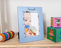 Portarretrato azul con nombre. Tamaño del portarretrato: 21cmx16cm. Tamaño de la foto: 14cmx9cm