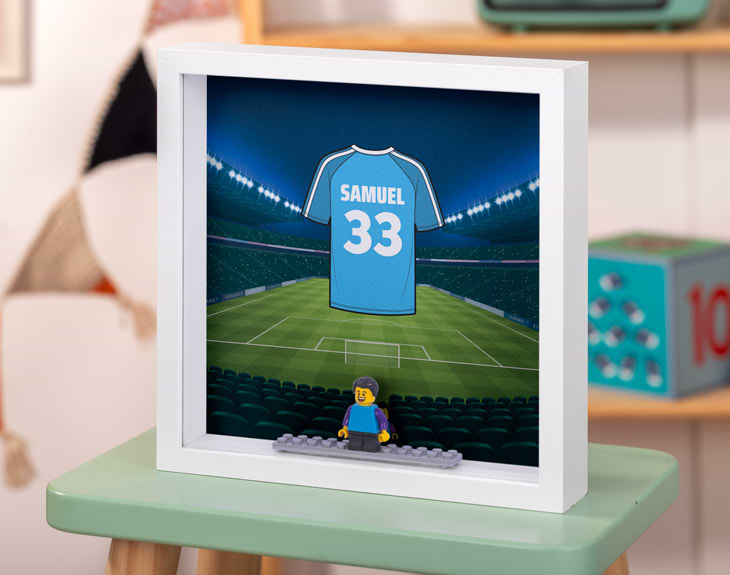 Si hay algo que emociona a los pequeños amantes del deporte es sentirse como auténticos protagonistas en el campo. Con este marco con minifigura y diseño “Camiseta de fútbol”, podrán tener su propio rincón futbolero donde su pasión por el balón sea la gran protagonista. Este original marco muestra el fondo de un estadio de fútbol y, en el centro, una camiseta personalizada que podrás diseñar como si fuera la de su propio equipo. Podrás elegir el color de la camiseta, añadir el nombre y el número que quieras, creando un detalle único para cualquier niño o niña que sueñe con marcar el gol de la victoria. El toque más especial lo pone la minifigura estilo Lego, que acompañará al diseño y convertirá el marco en una pieza divertida y muy especial para decorar su habitación. Un recuerdo perfecto para los pequeños futboleros que viven cada partido con ilusión y que sueñan con saltar algún día al campo como sus ídolos. Este regalo original para niños apasionados por el fútbol es ideal para cumpleaños, comuniones o cualquier ocasión en la que quieras sorprender a un pequeño fan del deporte rey. Un detalle que quedará genial en su escritorio, estantería o mesilla y que le recordará cada día su amor por el fútbol. ¿Cómo personalizarlo? Es muy fácil. Añade el producto al carrito y accede al área de personalización. Allí podrás elegir el color de la camiseta, escribir el nombre y el número que quieras que aparezcan en el diseño. Nosotros nos encargaremos de preparar este marco personalizado para fans del fútbol, listo para regalar. Medidas del marco: 21,5 x 21,5 x 4,5 cm Medidas de la minifigura: 4 cm de alto Importante: según stock puede contener una pequeña ranura en la parte superior o no. En el caso de que alguna pieza no esté disponible, se sustituirá por otra similar.