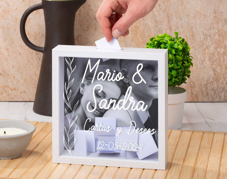 ¡El amor es uno de los sentimientos más bonitos que hay! Si tú has tenido la suerte de conocer al amor de tu vida, está claro que tenéis que celebrarlo por todo lo alto. Tenemos un regalo perfecto para vosotros. Se trata de nuestro marco hucha personalizada "Deseos de boda". Es ideal para que os escribáis vuestro deseos o sentimientos y los guardéis en esta hucha. Y el día de vuestra boda los podéis leer o incluso cuando sea vuestro aniversario. ¡Será un momento de lo más sensible y romántico! Y lo mejor es que es personalizable, podréis escribir vuestros nombres o un mensaje de amor. Es una preciosa forma de demostraros lo mucho que os queréis. ¡Es genial! Personalizar este marco hucha es muy sencillo. El primer paso a seguir consiste en añadir el producto al carrito y entrar al área de personalización. Una vez ahí, ya puede escribir el mensaje de amor que tú quieras. Pronto estará perfecto y listo para regalar. ¡Será un original regalo para parejas! Medidas marco: 20cm x 20cm x 5cm. Importante: Este marco también tiene función de hucha, por lo que cuenta con una ranura. ¡Podrás meter todos tus ahorros!