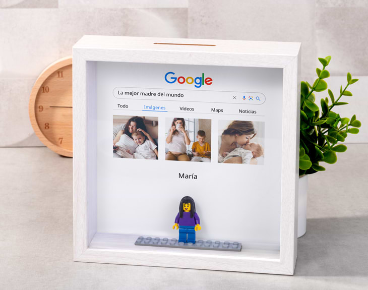 Si alguna vez has buscado en Google “la mejor mamá del mundo” y pensaste que debería salir la cara de la tuya… entonces este marco es para ti (o mejor dicho, ¡para ella!). Este marco de madera con minifigura Lego es un regalo tan original como emotivo, perfecto para sorprender a mamá en su día. Con un diseño divertido que simula una búsqueda de Google, podrás añadir hasta tres fotos que reflejen vuestros mejores momentos y personalizar la minifigura Lego para que se parezca a ella. Pelo, ropa, accesorios... ¡tenemos un montón de opciones para que la recrees a la perfección! Ideal si mamá pasa mucho tiempo frente al ordenador o si simplemente quieres sacarle una sonrisa con un regalo original, hecho con amor. ¿Cómo personalizarlo? Muy fácil. Añade el producto al carrito, entra en el área de personalización y empieza a diseñar tu minifigura. Luego, sube vuestras fotos favoritas y completa el texto para que todo encaje perfecto. ¡Nosotros nos encargamos del resto! Un detalle divertido, tierno y personalizado que se convertirá en un regalo original para el Día de la Madre. Medidas marco: 21,5 x 21,5 x 4,5cm Medidas figura Lego: 4cm de alto. Importante: según stock puede contener una pequeña ranura en la parte superior o no. En el caso de que una pieza no esté disponible, se sustituirá por otra similar.