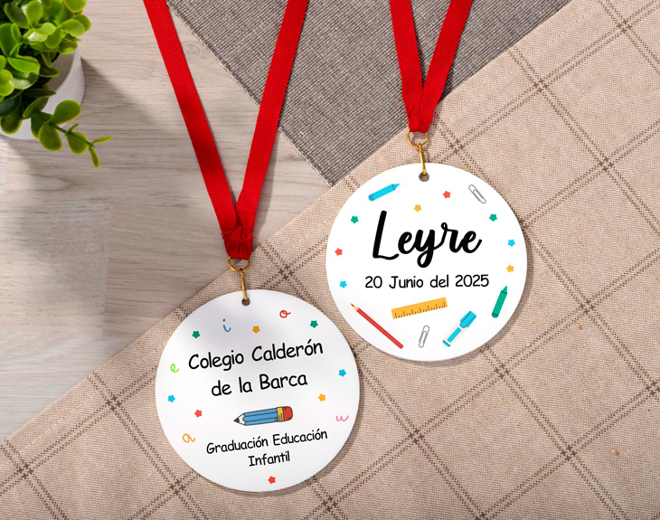 Sin duda, uno de los momentos más esperados por cualquier estudiante es el día de la graduación. Llevas tiempo soñando con ese día tan especial para celebrarlo por todo lo alto. En Regalo Original te presentamos esta medalla redonda personalizada, con un diseño lleno de lápices, color y alegría, ¡perfecta para los más peques de la casa! Estarán encantados y se sentirán reconocidos con todos los honores en su gran día. Esta medalla doble cara personalizable es ideal para demostrarles lo orgullosos que estamos de ellos y hacerles sentir importantes y felices tras tantas clases, exámenes y trabajos de última hora. Puedes personalizarla con el texto que quieras, una frase motivadora o cualquier mensaje con cariño. Será el mejor recuerdo de graduación infantil que podrán guardar y atesorar siempre. Personalizarla es muy sencillo: añádela al carrito y no olvides diseñar las dos caras de la medalla. ¡Y listo! Tendrás un regalo para fin de curso que sacará una gran sonrisa. Diámetro: 10 centímetros. Material: metacrilato e incluye cuerda para colgar.