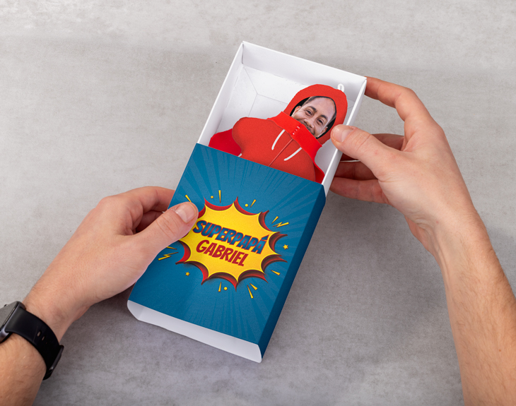 Padres que van sin capa, pero con poderes infinitos. Para el héroe que siempre está cuando hace falta: ¡Superpapá! Hemos creado un muñeco personalizado con foto, un regalo original perfecto para celebrar el Día del Padre. Porque ya es hora de que se convierta en el superhéroe que es todos los días. Este original muñeco personalizado se convertirá en el favorito de papá. Podrás elegir entre traje de superhéroe o sudadera roja y, además, añadir la cara de quien tú quieras para hacerlo único. Y como si fuera poco, el muñequito se presenta dentro de una caja personalizada, para que la sorpresa sea aún más especial desde el primer momento. Personalizar esta idea de regalo para padres es muy fácil. Solo tienes que acceder a nuestro diseñador, subir una imagen en la que se vea bien la cara de papá y ajustar el recorte para que quede perfecta. Nosotros nos encargamos del resto. ¡Nadie regalará nada igual! Sin duda, será el regalo más original para el Día del Padre. Medidas del muñeco: 14 x 9 cm. Medidas de la caja: 14x9,5 cm. Material: poliéster.