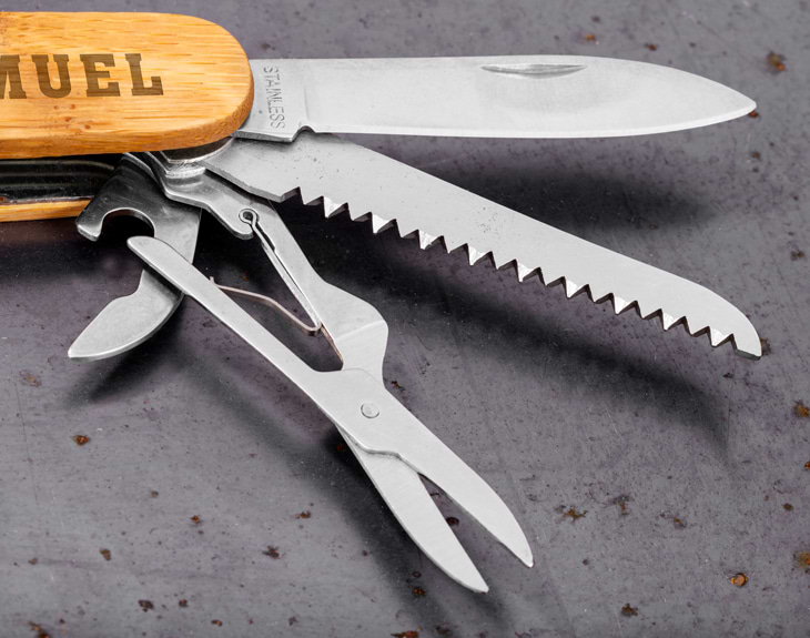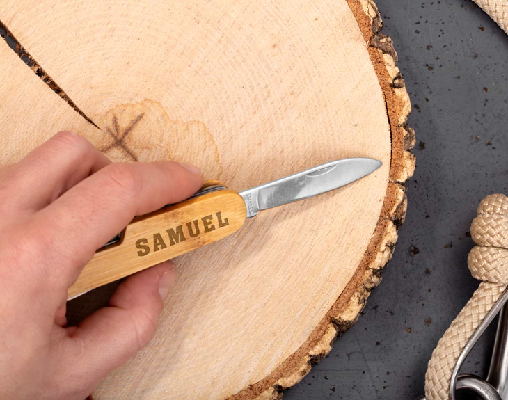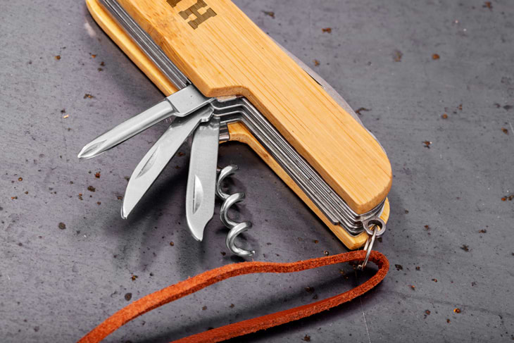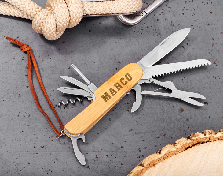 • Navaja de bambú multiusos grabada. • Tarjeta Recordatoria.