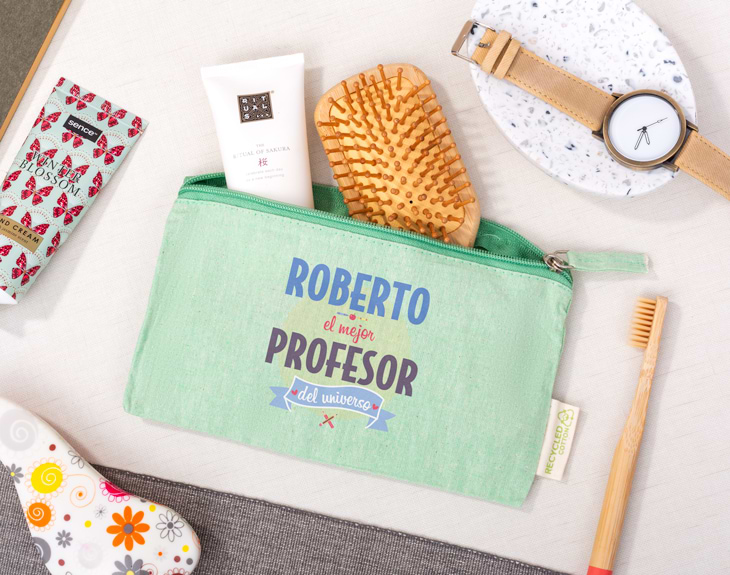 Los profesores son personas que marcan una diferencia en nuestras vidas y es que no sólo nos enseñan matemáticas, biología, lengua... También nos enseñan valores muy importantes de la vida. Ser profesor es una tarea difícil que todos apreciamos un montón. Si se acerca fin de curso, el día del profesor o simplemente quieres tener un detalle bonito este neceser de algodón personalizado es un regalo muy original y que usará siempre. Nuestro neceser tiene un diseño muy chulo en el que le darás un mensaje positivo a tu profe: que es el mejor del mundo. Una vez lo reciba seguro que no se despega de él, y es que no sólo lo puede usar como neceser, también se puede usar como estuche ya que tiene el tamaño perfecto. Sea como sea se convertirá en su detalle favorito y lo podrá llevar a cualquier sitio. Puedes escoger entre 4 colores distintos: rojo, gris, beige o verde. Además podrás añadir el nombre que desees para darle la personalización completa. Con este estuche/neceser acertarás seguro y está hecho de algodón reciclado, con el que estás haciendo tu pequeña aportación al medio ambiente. Material: algodón reciclado. Medidas: 21x12,5 cm.
