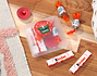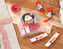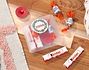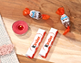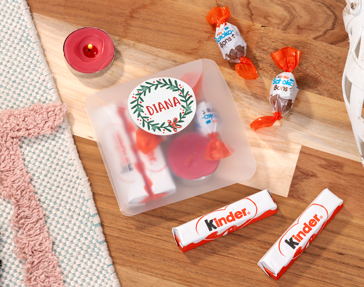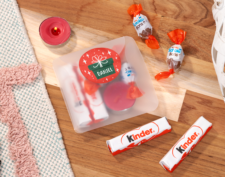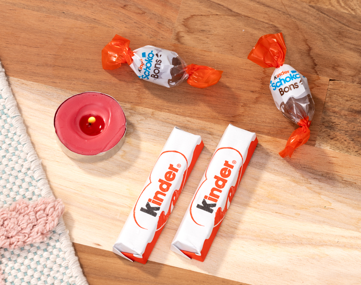 • Caja con pegatina personalizada. • 2 barritas Kinder. • 2 Kinder Schoko-Bons. • Vela roja. • Tarjeta recordatoria.