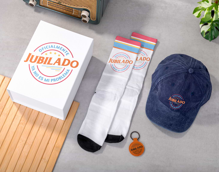 Celebra la jubilación de tu compañero de trabajo o familiar de una forma única y memorable. Para esa persona que ha dedicado años de esfuerzo y dedicación, un regalo tan especial como este pack es la forma perfecta de rendirle homenaje. Esta caja incluye una gorra retro, un llavero de cuero y unos calcetines, todo personalizado con su nombre. Un detalle original para despedir a lo grande a quien se embarca en una nueva etapa. Y lo mejor de todo es que este pack de jubilación es completamente personalizable. Desde la caja hasta cada uno de los productos que incluye. Imagina la emoción de esa persona al recibir un regalo tan único, pensado especialmente para ella, por parte de sus compañeros o seres queridos. Un toque personal que hará de su despedida algo realmente inolvidable. ¿Cómo personalizarlo? Es muy sencillo: solo tienes que añadir el pack a tu carrito y acceder a nuestro diseñador online. Allí podrás personalizar cada producto con el nombre que desees, visualizando el resultado final. Sin duda, un detalle especial que hará sonreír a quien lo reciba. Haz de su jubilación un momento único y especial con un regalo que siempre recordará. IIMPOTANTE: Gorra retro: Diámetro 59 cm. Material algodón. Llavero: Material cuero reciclado. Medidas 4,8 cm de diámetro. Color marrón. Calcetines: Talla única Medidas de cada calcetín 41 x 9 cm. Material poliéster. Caja: Medidas 25 x 18 x 11 cm.
