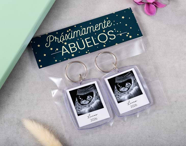 Hay noticias que merecen anunciarse de una forma inolvidable… y esta es, sin duda, una de ellas. Con nuestro pack de 2 llaveros transparentes personalizados podrás dar la gran sorpresa: ¡un bebé está en camino! El diseño incluye un cartoncito personalizado con el mensaje que tú quieras y dos llaveros transparentes con la imagen y texto que elijas. Imagina el momento: entregas la bolsita, leen el mensaje… y al mirar el llavero descubren la ecografía. Una sorpresa que se convertirá en lágrimas de felicidad, abrazos infinitos y uno de los recuerdos más especiales de vuestra historia. Es el regalo perfecto para anunciar un embarazo a los futuros abuelos, tíos o personas importantes. Además, al ser personalizable, podrás adaptar el texto del cartoncito y la imagen del llavero para que sea único y completamente vuestro. Después del gran momento, podrán llevar siempre consigo ese recuerdo tan especial colgado de sus llaves. Porque no es solo un llavero… es el inicio de una nueva etapa llena de amor. ¿Cómo personalizarlo? Añade el producto al carrito, accede al área de personalización y sube la imagen de la ecografía junto con el texto que quieras incluir en el cartoncito. Nosotros nos encargamos de prepararlo todo para que la sorpresa sea perfecta. Un detalle original y emotivo para anunciar la llegada de vuestro bebé de la forma más especial. Importante: la foto del llavero se visualizará solo por un lado. Medidas de cada llavero: 5,5 x 4,5 cm.