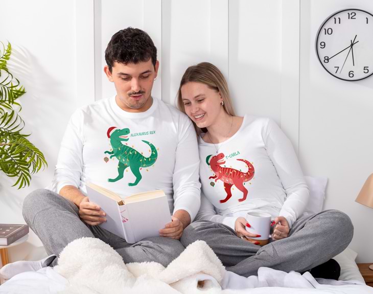¿Quieres disfrutar de una Navidad inolvidable junto a tu pareja, hijos o toda la familia? No hay nada más divertido que celebrar en pijama y con dinosaurios; así, la aventura será mucho más especial. Con nuestro pijama navideño personalizado, podrás hacerlo realidad. Diseñado especialmente para quienes aman celebrar con estilo, diversión y mucho cariño, este pijama se convertirá en la estrella de tus fiestas y todos querrán llevarlo. Es perfecto para abrir regalos en pijama, para fotos familiares navideñas o para disfrutar de una noche acogedora en familia, tanto en Navidad como en Nochebuena. Cada uno podrá tener el suyo, ir a juego con los demás, pero lo mejor es que cada pijama se puede personalizar con el nombre o apodo, ¡nadie tendrá uno igual! Además, puedes elegir entre tres diseños de dinosaurios para la camiseta y una gran variedad de colores para esta prenda. Sin duda, será la mejor Navidad de todas, una que recordaréis para siempre. Y si de lo contrario buscas un detalle especial para alguien en estas fiestas, este pijama es ideal como regalo de Navidad o cumpleaños. Sorprenderás de verdad y esa persona querrá dormir con su pijama navideño dinosaurio cada noche. Se convertirá en su favorito de la temporada y no querrá quitárselo. Personalizarlo es muy fácil: solo tienes que elegir el tipo de pijama que prefieras: verano o invierno, para adultos o niño, seleccionar la talla y el color de la camiseta, elegir el diseño de dinosaurio que más te guste y escribir el nombre. Y listo, tendrás tu pijama de Navidad personalizado que ruge fuerte como un dinosaurio, pero abraza suave. Disfruta de la magia de la Navidad con este regalo navideño para niños y adultos que hará que estas fiestas sean realmente especiales. Material: - Camiseta invierno: 100% algodón (excepto color gris: 85% algodón / 15% viscosa). - Camiseta verano: 100% algodón (excepto color gris: 85% algodón / 15% viscosa). - Pantalón invierno: 100% algodón. - Pantalón verano: 100% algodón. Importante: Las medidas son aproximadas, pueden variar 5cm por encima o por debajo. Importante: el tono de los colores puede variar en intensidad según stock