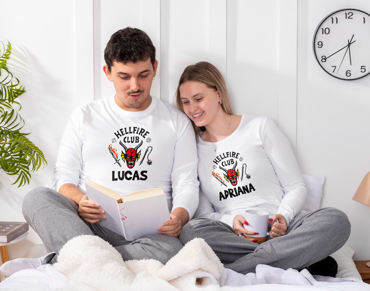 Si siempre has querido sentirte parte del legendario Hellfire Club, este pijama personalizado es tu invitación oficial a unirte al grupo más emblemático de Stranger Things. Inspirado en el espíritu rebelde del club, te permitirá lucir como un auténtico miembro de Hawkins mientras disfrutas de tus capítulos favoritos. Perfecto como regalo de Navidad, cumpleaños o para sorprender a cualquier fan de la serie con un detalle único. La verdadera magia está en que puedes personalizar el pijama con el nombre que quieras, convirtiéndolo en un regalo original, ideal para esas noches de series. Personalizarlo es muy sencillo: elige si lo quieres para adulto o infantil, selecciona entre pijama de invierno o de verano, escoge la talla y el color de la camiseta y escribe el nombre que quieras. En pocos pasos tendrás un pijama original que conquistará a cualquier fan de Stranger Things. Material: - Camiseta invierno: 100% algodón (excepto color gris: 85% algodón / 15% viscosa). - Camiseta verano: 100% algodón (excepto color gris: 85% algodón / 15% viscosa). - Pantalón invierno: 100% algodón. - Pantalón verano: 100% algodón. Importante: Las medidas son aproximadas, pueden variar 5cm por encima o por debajo. Importante: el tono de los colores puede variar en intensidad según stock