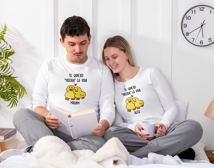 Cuando estás con la persona adecuada, cada momento juntos se disfruta el doble. Con estos pijamas para parejas “Te quiero patoda la vida”, las noches en casa, los domingos de sofá o los desayunos tranquilos se llenan de complicidad y mucho cariño. Un detalle pensado para compartir, reír y crear recuerdos juntos. Este pijama para parejas personalizado es una forma original y divertida de decir “te quiero”. Podrás personalizar cada camiseta con un nombre diferente, haciendo que el conjunto sea único y solo vuestro. Un diseño tierno y con mensaje, ideal para sorprender en un aniversario, en San Valentín o simplemente para recordar cada día lo mucho que os queréis. Personalizar estos pijamas de pareja es muy fácil. Solo tienes que añadir el producto al carrito y acceder al área de personalización. Allí podrás escribir los nombres y elegir el color del texto, seleccionando entre letras claras u oscuras según el color de la camiseta que escojas, para que el resultado sea perfecto. En pocos pasos estarán listos para regalar… o para estrenar juntos. Porque no hay mejor plan que disfrutar de los pequeños momentos en buena compañía y con un pijama que lo dice todo: te quiero patoda la vida. Material: - Camiseta invierno: 100% algodón (excepto color gris: 85% algodón / 15% viscosa) - Camiseta verano: 100% algodón (excepto color gris: 85% algodón / 15% viscosa) - Pantalón invierno: 100% algodón. - Pantalón verano: 100% algodón. Importante: Las medidas son aproximadas, pueden variar 5cm por encima o por debajo. Importante: el tono de los colores puede variar en intensidad según stock