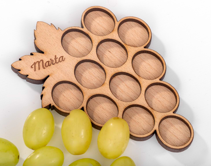 Es hora de dejas atrás este año y recibir el nuevo por todo lo alto. Si tú también sigues la tradición de tomarte las doce uvas, organízalas en este original portauvas de madera personalizado tan chulo. Es perfecto para esta ocasión tan especial, así cada persona tendrá sus uvas bien organizadas y listas para el momento más esperado. Este original adorno de madera es perfecto para que puedas tomarte las uvas tranquilo este año. Olvídate de meterlas en un vaso de plástico o cogerlas de la lata. Deja este portauvas en la mesa y coloca cada uva en su sitio. ¡A todo el mundo le encantará! Y lo mejor es que si entras en nuestro sistema, podrás personalizar este adorno con el nombre que quieras. Además, tú decides si quieres uno o varios portauvas y si los personalizas todos igual o de forma diferente. ¡Así mola mucho más empezar el año! Medidas: 11 x 7,6 cm. Importante: Este producto no incluye uvas.