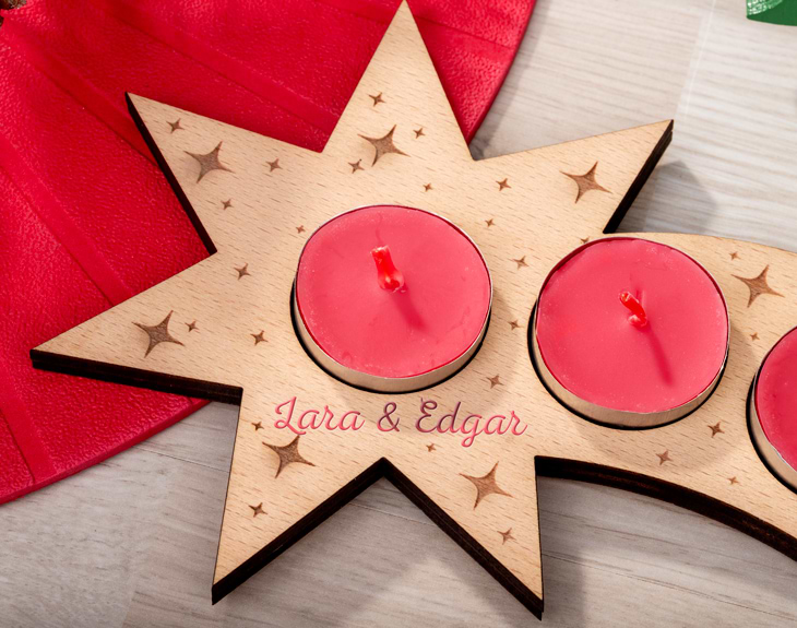 • Portavelas de madera personalizado. • 4 velas rojas pequeñas. • Tarjeta Recordatoria.