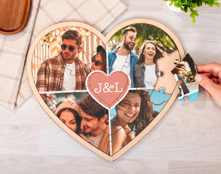 Es importante demostrarle a nuestra personita especial lo mucho que la queremos todos los días de nuestra vida, si hemos encontrado a alguien a quién amar somos suuuuper afortunados. Nuestro puzzle corazón de madera es un detalle muy bonito y especial que podrás tener con tu pareja y le hará mucha ilusión. Nuestro diseño corazón collage es muy chuli y podrás añadir hasta 4 fotos diferentes con tu pareja o que te recuerden a ella: vuestra mascota, ese paisaje tan especial... Tendrás libertad total para diseñarlo como desees. El corazón del centro donde irán vuestras iniciales está disponible en 4 colores distintos: rosa, azul, amarillo o morado, así podrás elegir el que más le guste a tu alma gemela y vaya con ella. Podréis montar el puzzle juntos en una tarde de fin de semana e ir formando poco a poco las fotos de esos momentos tan especiales de vuestras vidas. Tiene una base de madera donde montarás las piezas y encima podrás ponerle otra maderita en forma de corazón con un hueco en el centro para que estas no se muevan. Una vez lo hayáis terminado podréis enmarcarlo para que decore vuestra casa de la manera más romántica. Es el regalo original perfecto para cualquier fecha especial. Medidas: 35 x 27,5 x 0,8 cm.