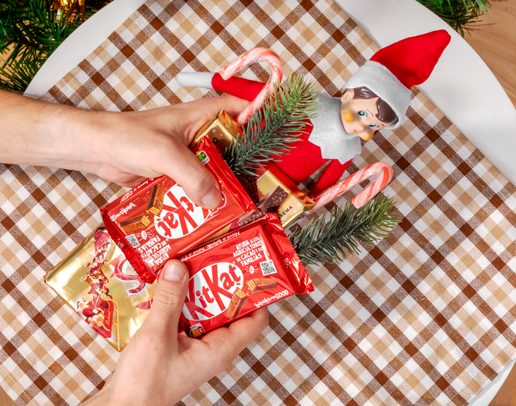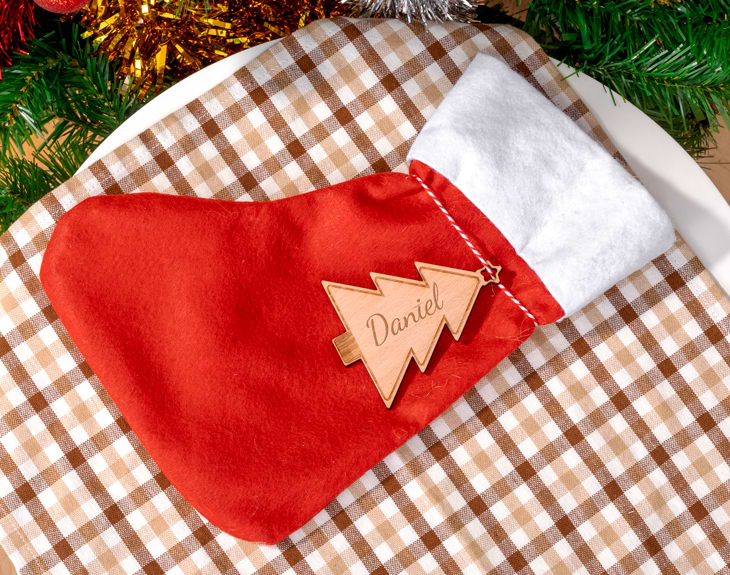 • Calcetín de Papá Noel. • Adorno de madera en forma de árbol personalizado. • Duende navideño. • 2 Kit Kat. • 2 Bastones de caramelo. • 1 Turrón Suchard clásico. • 2 ramas de abeto artificiales. • Tarjeta recordatoria.