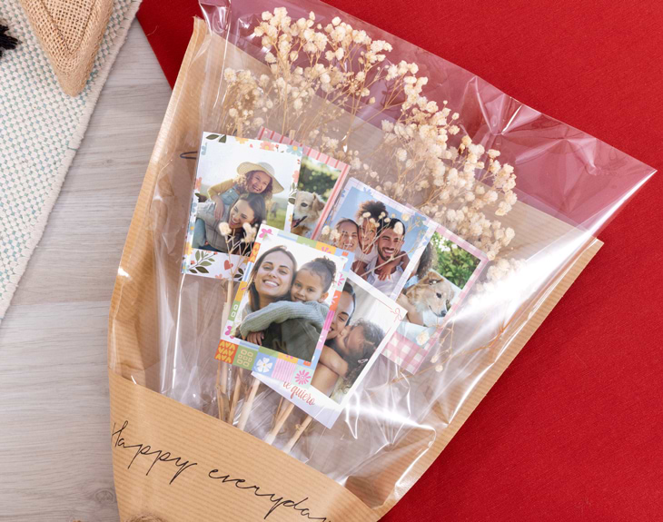 ¿Quieres sorprender a tu mamá con un regalo único y personalizado exclusivamente para ella? Entonces este ramo con fotos polaroid y flores es perfecto. Un detalle que combina vuestras imágenes más especiales con delicadas flores secas, creando un regalo único, emotivo y lleno de significado para el Día de la Madre. Podrás elegir hasta 6 fotos Polaroid para homenajear a mamá. Cada fotografía hará que tu madre reviva todo lo que habéis compartido en familia. ¡Este ramo personalizado para el día de la madre será el mejor! Personalizar tu ramo de Día de la Madre es muy sencillo. Añádelo al carrito, entra en el diseñador online y sube tus fotos. Nosotros nos encargamos de crear un regalo precioso, listo para emocionar. Si buscas un regalo original para madres o abuelas, este ramo lo tiene todo: amor, recuerdos y un diseño colorido. Importante: El orden de las fotos en el ramo es aleatorio. Medidas: 45 x 35 cm. Importante: Al ser flores naturales, recomendamos retirar el plástico al recibir el ramo para conservarlas mejor.