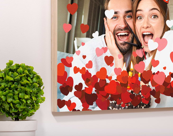 El reloj personalizado perfecto para sorprender a esa persona que consigue parar el tiempo cuando estáis juntos. Si gracias a tu pareja ser feliz parece la cosa más fácil del mundo, se merece un detalle así de especial. Nuestro diseño "Amor efervescente" está repleto de corazones alrededor de vuestra foto favorita...¡No hay mejor representación del amor! Tienes dos opciones de compra: Medidas reloj de pared: 49,5 x 30 cm. Medidas reloj de mesa: 27 x 20 cm. Importante: Las maderas tienen vetas y estas quedan reflejadas en la imagen. Instalación: el reloj de pared cuenta con agujeros en la parte posterior, hechos a medida por si quieres colgarlo utilizando tornillos, chinchetas, o lo que creas conveniente. ¡Cabrán perfectamente en los agujeros que vienen incluidos en la madera!