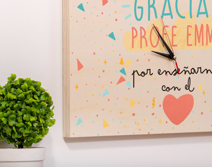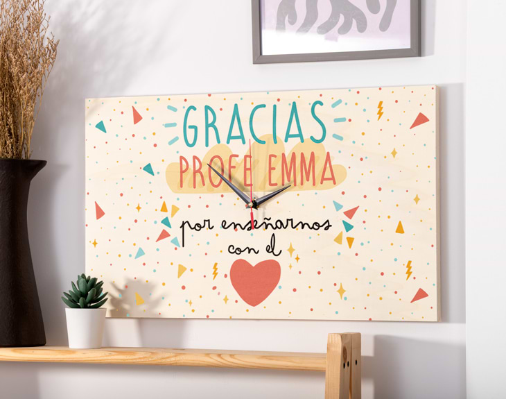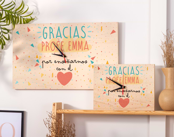 Si estáis buscando una forma divertida de darle las gracias a vuestro profe por todo lo que os ha enseñado, este reloj personalizado es el regalo perfecto. Este reloj de madera es un bonito detalle para sorprender a vuestro o vuestra profe y decirle lo mucho que valoráis su esfuerzo y trabajo, y sobre todo su infinita paciencia. Seguro que le hace mucha ilusión que todos sus alumnos se pongan de acuerdo en hacerle este detalle. Lo pondrá en su lugar favorito de la clase para que todo el mundo lo vea. ¡Le encantará! Tienes dos opciones de compra: Medidas reloj de pared: 49,5 x 30 cm. Medidas reloj de mesa: 27 x 20 cm. Importante: Las maderas tienen vetas y estas quedan reflejadas en la imagen. Instalación: El reloj de pared cuenta con agujeros en la parte posterior, hechos a medida por si quieres colgarlo utilizando tornillos, chinchetas, o lo que creas conveniente. ¡Cabrán perfectamente en los agujeros que vienen incluidos en la madera!
