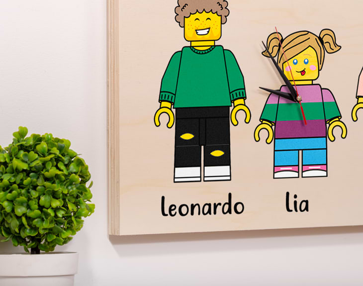 El regalo perfecto para los amantes de estos famosos muñecos. Y es que, ¿quién no ha pasado horas y horas jugando con los Lego? Pues ahora, puedes crear tu propio reloj personalizado con los miembros de tu familia. Solamente tienes que escoger los muñecos que más se parezcan a los miembros de tu familia y decirnos vuestros nombres...¿No te parece el reloj más original del mundo?¡Perfecto para decorar el salón de vuestra casa! Tienes dos opciones de compra: Medidas reloj de pared: 49,5 x 30 cm. Medidas reloj de mesa: 27 x 20 cm. Importante: Las maderas tienen vetas y estas quedan reflejadas en la imagen. Importante: a partir de 6 personajes irán distribuidos en dos filas. Es decir: - Familia de 6 personajes: 3 en la fila superior, y 3 en la inferior. - Familia de 7 personajes: 4 en la fila superior, y 3 en la inferior. - Familia de 8 personajes: 4 en la fila superior, y 4 en la inferior. Instalación: El reloj de pared cuenta con agujeros en la parte posterior, hechos a medida por si quieres colgarlo utilizando tornillos, chinchetas, o lo que creas conveniente. ¡Cabrán perfectamente en los agujeros que vienen incluidos en la madera!