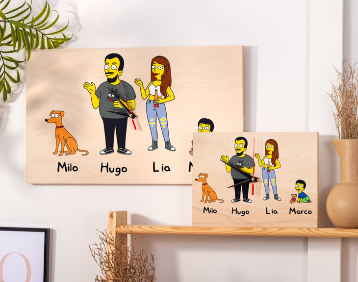 ¿En tu casa cualquier hora es buena para encender la tele y ver un capitulo de los Simpson? Si toda la familia sois fieles seguidores de la serie, este reloj personalizado está hecho para vosotros. Y es que, seguro que a pesar de haber visto mil veces todas las temporadas y saberos los diálogos de memoria, os seguís partiendo de risa con ellos. Si habéis crecido con la serie y los protagonistas han pasado a ser parte de vuestra familia, este diseño tiene vuestro nombre. Basta con que selecciones a los personajes que más se parezcan a vosotros y nos digas los nombres de cada uno. ¡Así os sentiréis como unos vecinos más de Springfield! Tienes dos opciones de compra: Medidas reloj de pared: 49,5 x 30 cm. Medidas reloj de mesa: 27 x 20 cm. Importante: Las maderas tienen vetas y estas quedan reflejadas en la imagen. A partir de 6 personajes, estos se distribuirán en dos filas en la toalla. Es decir: - Familia de 6 personajes: 3 en la fila superior, y 3 en la inferior. - Familia de 7 personajes: 4 en la fila superior, y 3 en la inferior. - Familia de 8 personajes: 4 en la fila superior, y 4 en la inferior. Instalación: El reloj de pared cuenta con agujeros en la parte posterior, hechos a medida por si quieres colgarlo utilizando tornillos, chinchetas, o lo que creas conveniente. ¡Cabrán perfectamente en los agujeros que vienen incluidos en la madera!