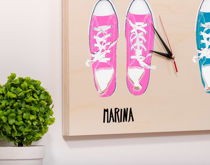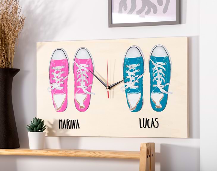 ¿Sois de esas familias que nada más entrar en casa os quitáis las zapatillas? Entonces este diseño está hecho para vosotros. Se trata de un reloj que podéis personalizar con las zapatillas que más os representen y vuestros nombres. Un regalo original para dejar sin palabras a las personas más importantes de tu vida. Así, cada vez que miréis la hora será imposible que no os salga una sonrisa...¿No te parece un gran accesorio para decorar vuestro hogar? Tienes dos opciones de compra: Medidas reloj de pared: 49,5 x 30 cm. Medidas reloj de mesa: 27 x 20 cm. Importante: a partir de 6 personajes irán distribuidos en dos filas. Es decir: - Familia de 6 personajes: 3 en la fila superior, y 3 en la inferior. - Familia de 7 personajes: 4 en la fila superior, y 3 en la inferior. - Familia de 8 personajes: 4 en la fila superior, y 4 en la inferior. Importante: Las maderas tienen vetas y estas quedan reflejadas en la imagen. Instalación: El reloj de pared cuenta con agujeros en la parte posterior, hechos a medida por si quieres colgarlo utilizando tornillos, chinchetas, o lo que creas conveniente. ¡Cabrán perfectamente en los agujeros que vienen incluidos en la madera!