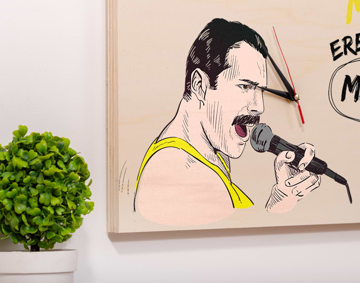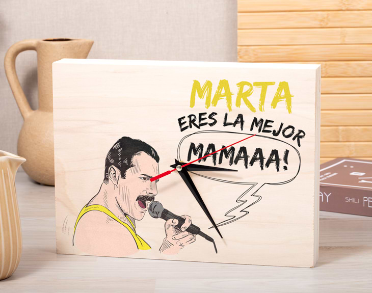 ¿En tu casa siempre hay música puesta? Si tu madre es la que pone el ritmo cada día, este reloj de madera personalizado es perfecto para darle una gran sorpresa. El detalle idóneo para esas mamás que adoran la música de los ochenta. Solo tienes que decirnos su nombre para personalizarlo al máximo y sentirá que Freddy Mercury le está cantanto directamente a ella...¡Seguro que se emociona muchísimo y se pone como loca a cantar y bailar! Tienes dos opciones de compra: Medidas reloj de pared: 49,5 x 30 cm. Medidas reloj de mesa: 27 x 20 cm. Importante: Las maderas tienen vetas y estas quedan reflejadas en la imagen. Instalación: el reloj de pared cuenta con agujeros en la parte posterior, hechos a medida por si quieres colgarlo utilizando tornillos, chinchetas, o lo que creas conveniente. ¡Cabrán perfectamente en los agujeros que vienen incluidos en la madera!