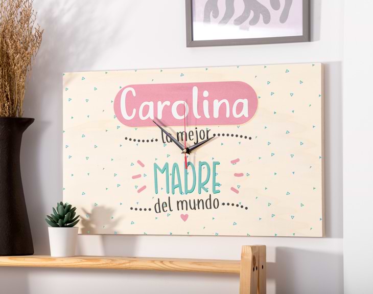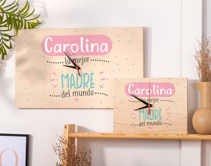 ¿Estás buscando un regalo muy original y emotivo para sorprender a tu madre en cualquier fecha señalada? Nuestro reloj de madera "Mejor mamá del mundo" es una opción increíble. Solo necesitamos que nos digas su nombre para insertarlo en este diseño tan tierno y tu mamá se quedará sin palabras al verlo. Un regalo súper especial para demostrarle que a su lado el tiempo pasa volando y que no hay nadie tan especial como ella. Tienes dos opciones de compra: Medidas reloj de pared: 49,5 x 30 cm. Medidas reloj de mesa: 27 x 20 cm. Importante: Las maderas tienen vetas y estas quedan reflejadas en la imagen. Instalación: El reloj de pared cuenta con agujeros en la parte posterior, hechos a medida por si quieres colgarlo utilizando tornillos, chinchetas, o lo que creas conveniente. ¡Cabrán perfectamente en los agujeros que vienen incluidos en la madera!