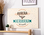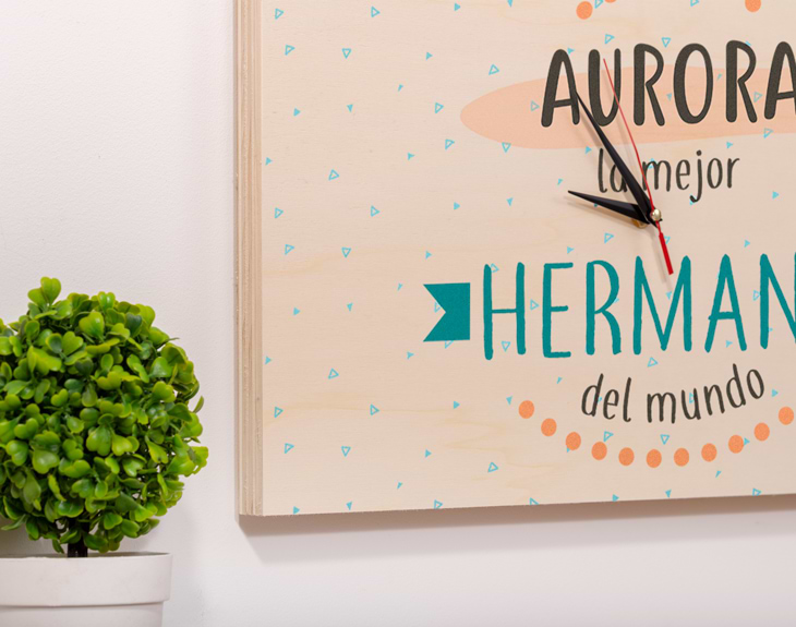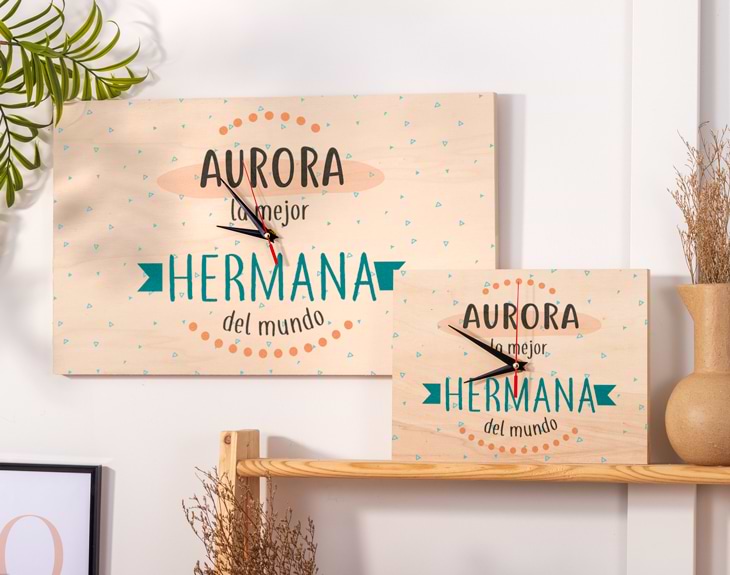 ¿Cuántas peleas y quejas a mamá y papá has sufrido con tu hermana? Si quieres demostrarle que a pesar de todas las peleas y discusiones lo mucho que la quieres y lo importante que es para ti, este es el regalo perfecto. Personaliza este reloj con su nombre y seguro que le hace muchísima ilusión. Aprovecha su cumpleaños o cualquier otra ocasión para sacarle una gran sonrisa. Tienes dos opciones de compra: Medidas reloj de pared: 49,5 x 30 cm. Medidas reloj de mesa: 27 x 20 cm. Importante: Las maderas tienen vetas y estas quedan reflejadas en la imagen. Instalación: El reloj de pared cuenta con agujeros en la parte posterior, hechos a medida por si quieres colgarlo utilizando tornillos, chinchetas, o lo que creas conveniente. ¡Cabrán perfectamente en los agujeros que vienen incluidos en la madera!