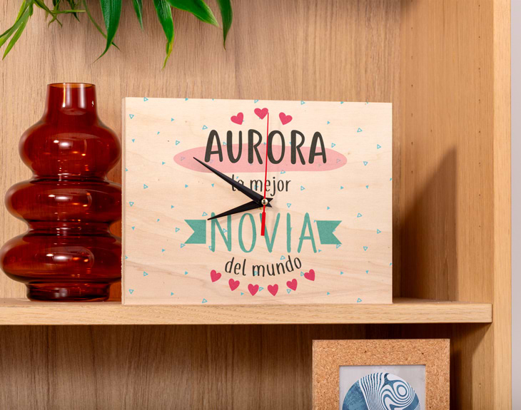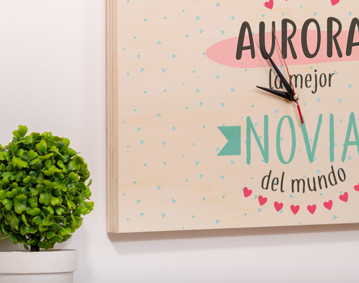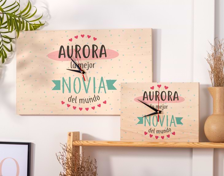 ¿Quieres sorprender a tu novia por su cumpleaños o por vuestro aniversario? Este reloj personalizado es el regalo perfecto. Se trata de un regalo muy original y además lo puedes personalizar con el nombre de tu chica. Estate seguro de que este reloj será el primer elemento de decoración de vuestra casa. Tienes dos opciones de compra: Medidas reloj de pared: 49,5 x 30 cm. Medidas reloj de mesa: 27 x 20 cm. Importante: Las maderas tienen vetas y estas quedan reflejadas en la imagen. Instalación: el reloj de pared cuenta con agujeros en la parte posterior, hechos a medida por si quieres colgarlo utilizando tornillos, chinchetas, o lo que creas conveniente. ¡Cabrán perfectamente en los agujeros que vienen incluidos en la madera!