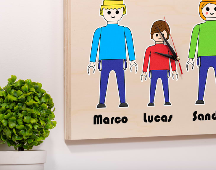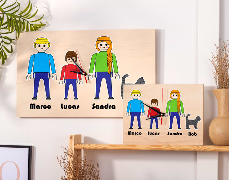 Si siempre te ha gustado jugar con la familia Playmobil y en tu casa creabas muchísimos universos para jugar con tus hermanos o amigos, este reloj personalizado es perfecto para ti. Si quieres sorprender a tu familia para recordarle lo bien que te lo pasas de pequeño, este regalo es perfecto para sacarles una sonrisa. ¿Cuántas veces has querido esperar al Día de la Madre o el Día del Padre para dar una sorpresa en casa? Ahora tienes la oportunidad de hacerlo: solo tienes que escoger de todos los personaje de Playmobil que hemos creado los que más se ajusten a tu familia. ¡No te olvides de poner el nombre de cada miembro de la familia! Tienes dos opciones de compra: Medidas reloj de pared: 49,5 x 30 cm. Medidas reloj de mesa: 27 x 20 cm. Importante: Las maderas tienen vetas y estas quedan reflejadas en la imagen. Importante: a partir de 6 personajes irán distribuidos en dos filas. Es decir: - Familia de 6 personajes: 3 en la fila superior, y 3 en la inferior. - Familia de 7 personajes: 4 en la fila superior, y 3 en la inferior. - Familia de 8 personajes: 4 en la fila superior, y 4 en la inferior. Instalación: El reloj de pared cuenta con agujeros en la parte posterior, hechos a medida por si quieres colgarlo utilizando tornillos, chinchetas, o lo que creas conveniente. ¡Cabrán perfectamente en los agujeros que vienen incluidos en la madera!