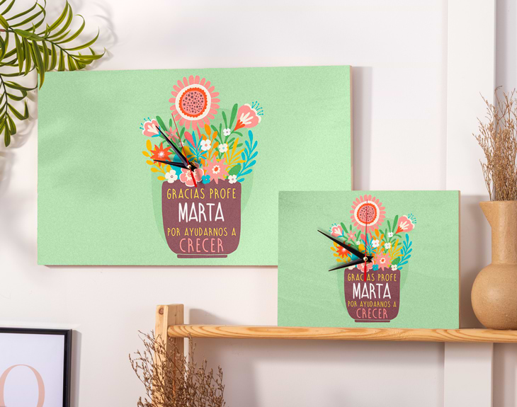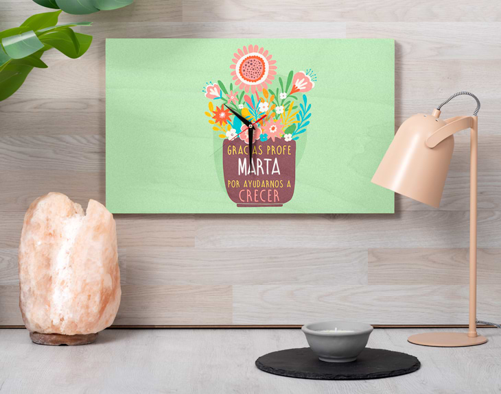Se acerca el último día de clase, el momento perfecto para impresionar a vuestra profe con un detalle tan emotivo como este reloj de madera personalizado. Solo hace falta echar la vista atrás y ver lo muchísimo que habéis aprendido y madurado en este año...¡Y todo gracias a vuestra profesora o profesor! Le encantará tener un regalo tan original y especial de sus alumnos. ¡Le encantará! Medidas reloj de pared: 49,5 x 30 cm. Medidas reloj de mesa: 27 x 20 cm. Importante: Las maderas tienen vetas y estas quedan reflejadas en la imagen. Instalación: el reloj de pared cuenta con agujeros en la parte posterior, hechos a medida por si quieres colgarlo utilizando tornillos, chinchetas, o lo que creas conveniente. ¡Cabrán perfectamente en los agujeros que vienen incluidos en la madera!