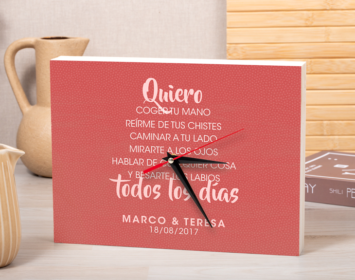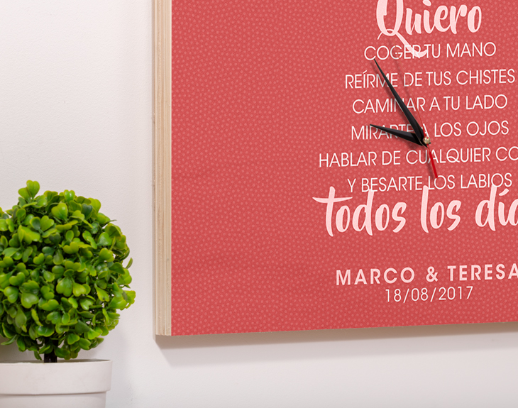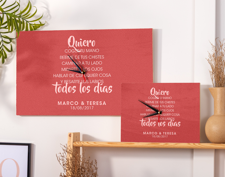 Qué bonito es ver que pasa el tiempo y tú puedes disfrutar de tu pareja. Es un regalo súper romántico para las novias o los novios que no pueden estar un día sin el otro. ¿A vosotros os pasa? Este reloj de madera es perfecto entonces. Tienes dos opciones de compra: Medidas reloj de pared: 49,5 x 30 cm. Medidas reloj de mesa: 27 x 20 cm. Importante: Las maderas tienen vetas y estas quedan reflejadas en la imagen. Instalación: el reloj de pared cuenta con agujeros en la parte posterior, hechos a medida por si quieres colgarlo utilizando tornillos, chinchetas, o lo que creas conveniente. ¡Cabrán perfectamente en los agujeros que vienen incluidos en la madera!