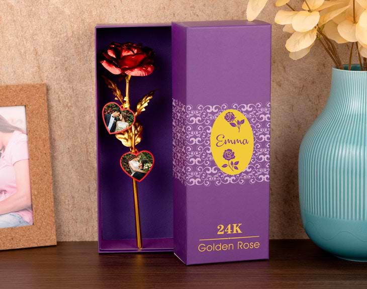 San Valentín está a la vuelta de la esquina. Es el mejor día del año para profesarle tu amor a la persona que más quieres, al amor de tu vida. No hay día más acertado que el 14 de febrero para mostrarle todo tu cariño al hombre o mujer de tu vida. ¡Hay que tener un detalle con él o ella! ¿y qué hay más bonito para el día de San Valentín que una flor? Es el regalo más típico durante esta fiesta pero también con el que la gente más acierta. Y es que a todo el mundo le gusta recibir una rosa por San Valentín pero, ¿te imaginas recibir una rosa roja bañada en oro como esta? ¡Es un regalo de lo más original e inesperado! Esta rosa está elaborada en polietileno y está bañada en oro de 24 kilates. Estas rosas se elaboran de manera artesanal, lo que hace que sea un regalo aún más especial. Debido al tremendo trabajo que cuesta cada una de las rosas, no hay dos iguales: ¡todas son únicas! Y para que esta flor sea todavía más fiel, los pétalos están pintados de rojo. Podrás personalizar este producto de varias formas: primero, podrás añadir el nombre del afortunado/a en la caja, dependiendo del nivel de detalle de tu regalo. Y por si esto fuera poco, del tallo colgaremos unos corazones dorados hechos con metacrilato. Ahí podrás añadir las fotos que quieras. ¡Escoge vuestros mejores momentos y nosotros los plasmaremos en este regalo original! Datos técnicos: • Baño en oro de 24 kilates. • Dimensiones: 25,5 x 8,5 centímetros.