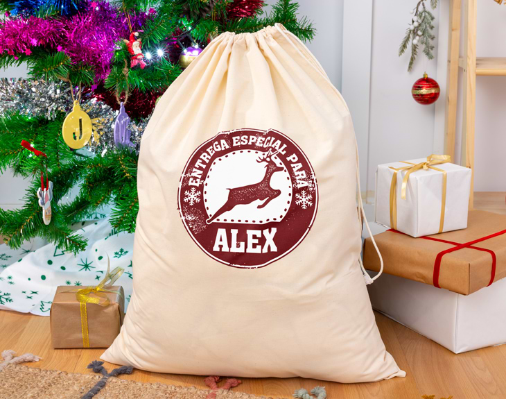 Pocos momentos hay más especiales a lo largo del año como la llegada de Papá Noel y los Reyes Magos, ya que vienen acompañados de montañas de regalos. Pero, hasta en una situación así, los detalles marcan la diferencia. Y tú puedes hacerlo con este bonito saco de regalos personalizado. Hecho en yute, lo personalizamos con el nombre que tú nos digas. Así, podrás meter en él todos los regalos que quieras y que vea el saco nada más entrar en la habitación. ¡La navidad nunca había sido tan especial! Dimensiones aproximadas: 65 x 50 cm.