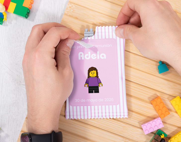 • Sobre personalizado con minifigura compatible con Lego. • Tarjeta recordatoria.