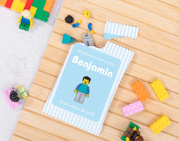 La Primera Comunión es uno de esos días que se recuerdan para siempre… y qué mejor que acompañarlo con un detalle bonito y original. Este sobre personalizado diseño de rayas estilo marinero, inspirado en el clásico atuendo de comunión, es perfecto para la ocasión. Dentro encontrarás 1 minifigura compatible que hará mucha ilusión, tanto al protagonista como a los invitados. Es un detalle sencillo pero diferente, ideal como recuerdo de comunión o regalito para sorprender a todos. El sobre se puede personalizar con el nombre, la fecha o un mensaje, para que cada uno se lleve un recuerdo único de ese día tan especial. Además, la figura se entrega sin montar, lo que lo hace aún más divertido. ¿Cómo personalizarlo? Muy fácil: añade el producto al carrito, escribe el texto que quieras y nosotros nos encargamos del resto. Un detalle de comunión original, con ese toque tradicional marinero que nunca falla. Importante: Las minifiguras se mandan dentro del sobre sin montar. Medidas bolsa grande: 20 x 13,5 cm. Medidas bolsa pequeña: 14 x 9,5 cm. Medidas figuras compatible con Lego: 4 cm de alto.