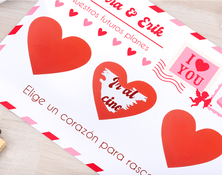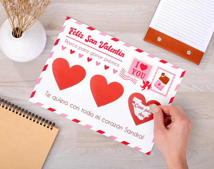 Haz que este San Valentín sea diferente y lleno de emoción con esta tarjeta personalizada para rascar. En su interior podrás esconder tres mensajes secretos y convertir esta carta en una auténtica caja de sorpresas. Imagina la ilusión de tu pareja al ir descubriendo, uno a uno, lo que se esconde detrás de cada corazón. Podrás personalizar los tres corazones para rascar con los textos que quieras: una declaración de amor, un plan especial, un viaje sorpresa o cualquier mensaje que salga del corazón. Además, no solo se personalizan los mensajes ocultos, también podrás escribir todo el contenido de la carta, creando un detalle totalmente único. Gracias a su diseño, no habrá una carta más especial para celebrar el Día de los Enamorados. Diseñarla es súper sencillo. Solo tienes que añadir esta original tarjeta de San Valentín al carrito y acceder a nuestro diseñador online. Allí podrás completar todos los espacios con los textos y mensajes que desees. Nosotros nos encargamos de que el resultado sea perfecto para que puedas sorprender con un regalo original para parejas que enamora desde el primer vistazo. IMPORTANTE: al escribir el mensaje, revisa que el texto quede bien encajado dentro de los corazones, ya que se imprimirá tal y como se vea en el diseño. Medidas de la tarjeta: A4