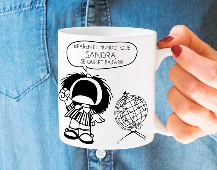 Nada como un poco de humor y sarcasmo del bueno para empezar el día. Desayuna todos los días junto a la icónica Mafalda con esta taza original personalizada. Con su capacidad de 330 mililitros, te servirá para el chocolate, el café, tu casa, el trabajo... Llévate la genial ironía de esta tira cómica vayas donde vayas, cada vez que necesites un respiro. Además de ser un complemento útil, también es el regalo más original para los fans de esta historieta y de su creador. ¡Parecerá como si el mismísimo Quino hubiera contado contigo para su dibujo! Dinos tu nombre y nosotros lo inscribimos en la taza, para que formes parte de este pequeño gag de Mafalda. Llévate este bonito homenaje diario al reconocido humorista gráfico argentino por menos de 10€. Si quieres más tazas para regalar a algún amigo o familiar, por tan solo 12€ te llevas dos. ¡Y por menos de 20€ hasta 4! Aprovecha esta oportunidad y regala esta divertida mini-historieta personalizada que tus amigos o familiares usarán a diario en esta original taza personalizada.