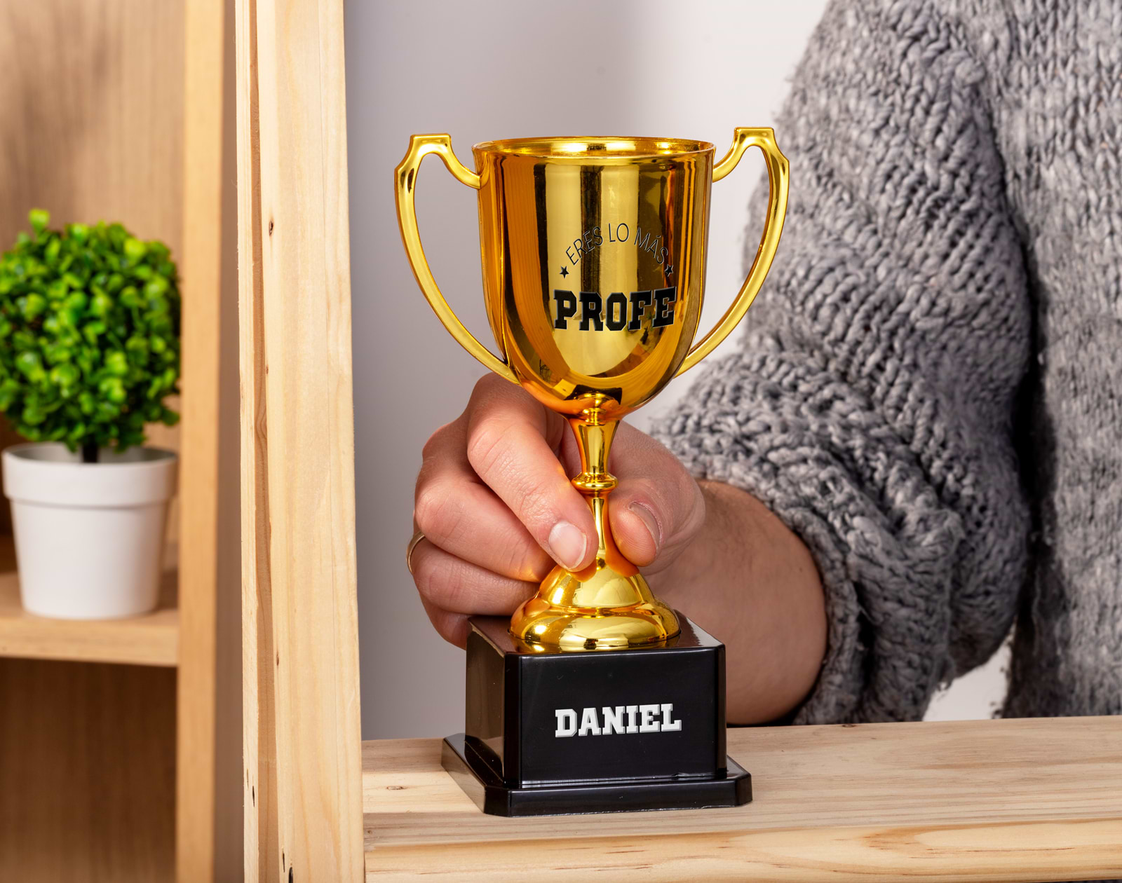 Este año, ¡nada de regalos repetidos! Se acabó regalar lo mismo de siempre. Este fin de curso sorprende a tu profe con algo realmente especial: un trofeo personalizado. Una forma divertida y original de agradecerle todo su esfuerzo, premiar su dedicación y recordarle lo mucho que significa para la clase. ¡Le va a encantar! Este trofeo tan original quedará genial en su escritorio o estantería, y lo lucirá con orgullo sabiendo que sus alumnos pensaron en él. ¿Lo mejor? Podéis personalizarlo con su nombre, el de la clase, el año o el mensaje que queráis. Junto a la frase "Profe, eres lo más", cualquier detalle que añadáis lo hará aún más especial. Personalizarlo es muy fácil: solo tenéis que añadir el producto al diseñador, rellenar los recuadros en blanco... ¡y listo! En pocos pasos tendréis un regalo original para profesores, perfecto para cerrar el curso con una gran sonrisa. Porque un buen profe... ¡se merece estar en el podio! Medida: 18 x 10,5 cm aprox. Material de la copa y de la base: plástico.