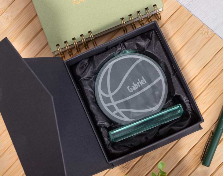 ¿Tienes la suerte de tener al mejor papá del mundo? Si siempre te cuida un montón y además, os lo pasáis de maravilla juntos, está claro que tienes que demostrarle todo el amor que sientes. Por eso, creemos que se merece el premio al mejor padre del mundo y nuestro trofeo personalizado será ideal para sorprenderle por el Día del Padre. Y es que si tienes unos preciosos recuerdos con tu padre de tardes enteras jugando al baloncesto, este trofeo es perfecto para él, porque tiene un estampado de baloncesto. Es una forma de demostrarle lo mucho que aprecias esos buenos recuerdos. Además, es personalizable, podrás poner el nombre del mejor padre del mundo. Personalizar este trofeo de baloncesto es súper sencillo. El primer paso a seguir consiste en añadir el producto al carrito y entrar al área de personalización. Una vez ahí, ya puedes escribir el nombre del mejor papá del mundo. Pronto estará perfecto y listo para regalar. ¡Será un original regalo para padres! Material: cristal. Altura del trofeo: 11 cm. Medidas base: 1 cm x 6 cm x 10 cm.