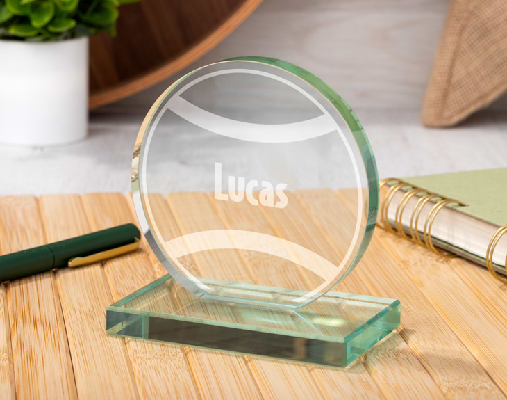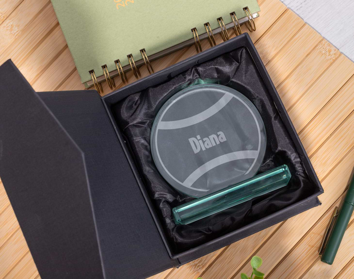 ¿Te acuerdas de esas tardes enteras jugando en el parque con tu papá? Si para ti han sido de los mejores recuerdos de tu infancia, está claro que tienes que hacerle un detalle para demostrarle lo mucho que te gustaba jugar con él. Nuestro trofeo personalizado con diseño "Tenis" será el regalo perfecto. ¡Se quedará sin palabras! Si se acerca alguna fecha especial con su cumpleaños o el Día del Padre, sorprendele con este trofeo tan chulo. Lo mejor es que es personalizable, podrás escribir el nombre del mejor papá del mundo. Y es que si os encantaba jugar juntos al tenis este producto es genial porque tiene estampado una pelota de tenis. Por último, para personalizar este trofeo de tenis es muy sencillo. El primer paso a seguir consiste en añadir el producto al carrito y entrar al área de personalización. Una vez ahí, ya puedes escribir el nombre que tú quieras y nosotros nos encargamos de grabarlo. Pronto estará perfecto y listo para regalar. ¡Será un original regalo para padres! Material: cristal. Altura del trofeo: 11 cm. Medidas base: 1 cm x 6 cm x 10 cm.