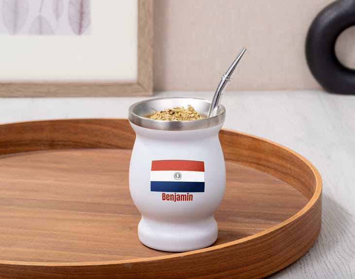 Hay tradiciones que se viven cada día… y en Paraguay, el mate y el tereré forman parte de la esencia. Si buscas un detalle especial para alguien que lleva su cultura siempre consigo, este vaso de mate personalizado con la bandera de Paraguay es una opción perfecta. Diseñado para los verdaderos amantes de esta bebida, podrás personalizarlo con el nombre que quieras, creando un regalo único, práctico y lleno de significado. Fabricado en acero inoxidable, este mate es resistente y mantiene la temperatura durante más tiempo, ideal tanto para disfrutar en casa como para llevar a cualquier lugar. Su tamaño lo hace cómodo y funcional para el día a día. Está disponible en varios colores (azul, blanco, negro o rojo) y, además, incluye bombilla de acero inoxidable y cepillo limpiador, para que tengas el kit completo desde el primer momento. Personalizar tu mate es muy sencillo: añade el producto al carrito, escribe el nombre en el diseñador y visualiza cómo quedará antes de finalizar tu pedido. Un regalo original para paraguayos que une tradición, identidad y estilo en cada sorbo.