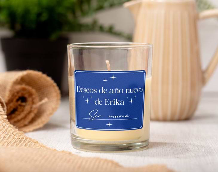 El comienzo de un nuevo año siempre está lleno de ilusión, de planes por cumplir y deseos que queremos ver hacerse realidad. Y para acompañar esos momentos tan especiales, nada mejor que nuestra vela en vaso personalizada “Deseos de Año Nuevo”. Un detalle precioso, perfecto para llenar cualquier rincón de luz, calma y buena energía. Esta vela no solo decora; también transforma el ambiente. Podrá colocarla en su mesita favorita, en el salón o donde quiera, y cada vez que la encienda sentirá ese toque acogedor que solo una vela especial puede dar. Además, podrás elegir el aroma que más le guste entre las fragancias disponibles, para que el nuevo año empiece oliendo exactamente a lo que sueña. Y lo más bonito: es personalizable. Solo tienes que añadir el producto al carrito, acceder a nuestro diseñador online y escribir la frase o el mensaje que quieras dedicar. Es el detalle ideal para Año Nuevo, para un amigo invisible o simplemente para sorprender a alguien que quieres. Empieza el año con buenos deseos y una vela tan especial como la persona que la reciba. ¡Un regalo que ilumina más que nunca! Medidas: 8 cm. de altura.